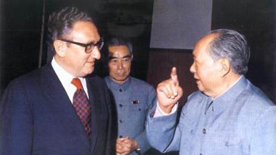 接下来是议论国际形势和中苏关系。毛泽东说:“我们希望你们跟欧洲、跟日本合作啊。我跟一个外国朋友谈过,说要搞一条横线,就是纬度,美国、日本、中国、巴基斯坦、伊朗、土耳其、欧洲。”基辛格说:“我们的观念十分相似!”毛泽东说:“你们西方历来有条政策,两次大战开始,都是推动德国打俄国。”这下子基辛格反应过来了,立即申辩地说:“推动俄国打中国不是我们的政策。”毛泽东说:“我正要讲这句话,是不是你们现在推动西德跟俄国讲和,然后又推动俄国向东进,我怀疑整个西方有这么一条路线。向东,主要向我们,而且向日本,也有一部分向你们,在太平洋和印度洋。如果有什么俄国人打中国,我今天对你讲,我们的打法是打游击,打持久战。他要去哪里就去哪里,让他去欧洲和你们以为这一下子可好了,总希望这股祸水到中国那里去哩。世界上的事难说啊,我们宁可这么想比较好,从坏处想。”基辛格说:“如果进攻中国出于我们自己的原因,我们肯定也会反对他们的。”
