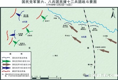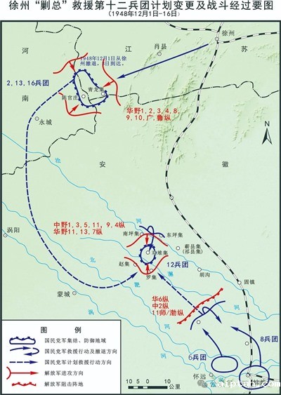 3日晨,突接奉统帅部空投命令一纸,略以匪军正由濉溪口向永城急进,该部应即转向濉溪口攻击前进,协同蚌埠第六兵团,南北夹击该匪,进而解第十二兵团之围。[6]