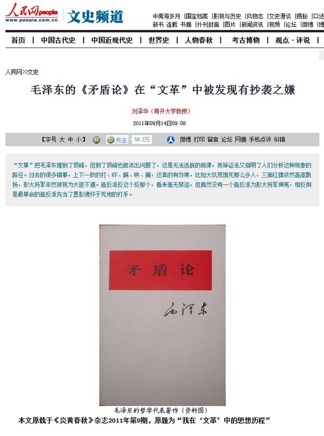 如蝇逐臭的“凤凰网”,立即嗅到了这股臭气,忙不迭地在9月14日专门转载了此文,还做了个耸人听闻的标题《南开大学教授刘泽华:<矛盾论>有抄袭之嫌》(http://news.ifeng.com/history/zhongguoxiandaishi/detail_2011_09/14/9165139_0.shtml),其有关内容如下:
