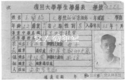 王朴(王兰骏)复旦大学学生学籍表(复印)