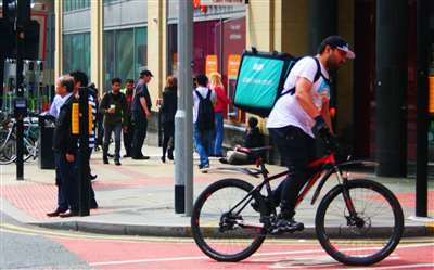 ◉曼彻斯特市中心的Deliveroo外卖员。来源:www.shopblocks.com.jpg/Wikimedia Commons