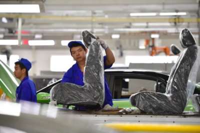 2019年6月12日,工人在比亚迪西安基地总装车间准备为新能源汽车安装座椅。图源:新华社