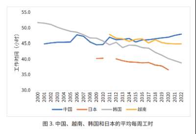 从纵向对比看,中国近十几年,工时有不断延长的趋势,甚至在疫情期间都在延长,现实中的两班倒代替了五天八小时成为主流工时,从横向对比看,国际劳工组织撰写的《中国劳动力市场的工时不足、工时过度及工时错配》显示,中国工人的工时既高于发达国家(如日本,韩国),也高于发展中国家(如越南)。