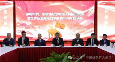 2025年8月22日,旅朝华侨、留学生共同举办纪念中国人民抗日战争暨世界反法西斯战争胜利80周年座谈会。中国驻朝鲜大使王亚军出席并讲话,朝鲜华联会中央委员会委员长赛铁军主持,冯春台公使等使馆外交官、中国人民志愿军烈士褒扬代表处及在朝中资机构和媒体代表等参加。座谈会上,旅朝华侨代表结合祖辈抗战事迹踊跃发言,回顾中国共产党团结领导中华儿女英勇抗战光辉历程和中朝军民同仇敌
