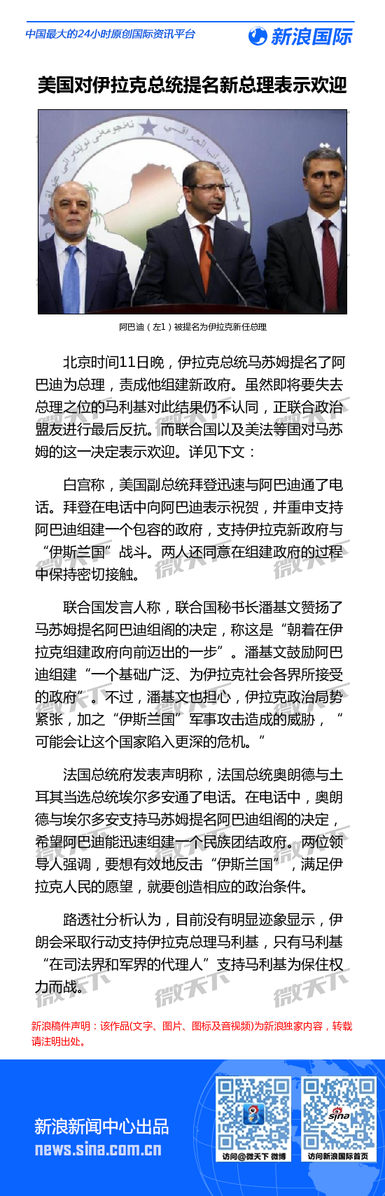 伊拉克总统提名新总理 美国等国赞扬该决定