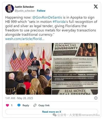 据新浪财经消息,2025年5月27日,佛罗里达州州长德桑蒂斯签署法案,正式承认黄金和白银为州内法定货币,并建立贵金属货币法律框架,声称要为民众提供“对抗美元贬值”的工具。此举引发广泛讨论:美国内部“去美元化”是否会对美元霸权构成威胁?黄金白银真能成为普通民众的保值手段? 另据消息,类似佛罗里达这样做的州,还不止一个。 这是个石破惊天的大事,必须高度