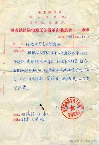 1973年9月7日宝鸡工务段下发的“宝工革(173)字第240号通知”:“根据高等学校学生入学通知书第0389号通知,我段陈光中同志经群众推荐,报请西安铁路局批准,被录取为大连铁道学院学员。自一九七三年九月底工资停发,由学校发给学员生活费。”