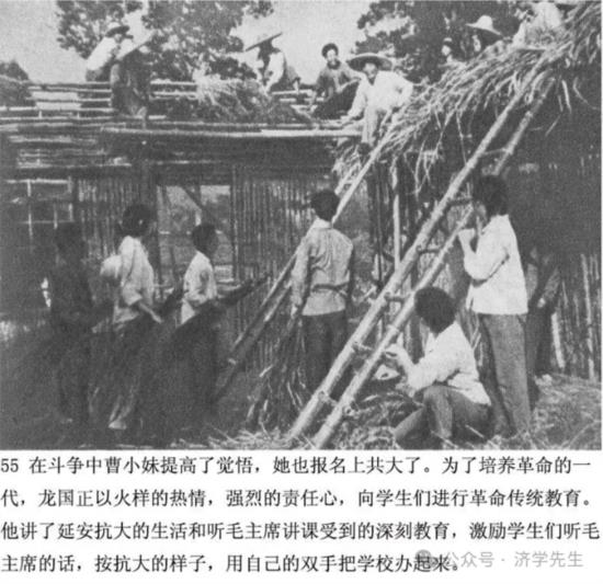 这个情节是副校长的女儿曹小妹报名上共大来和大家一起自己动手盖竹楼时,请龙校长讲延安的场景。