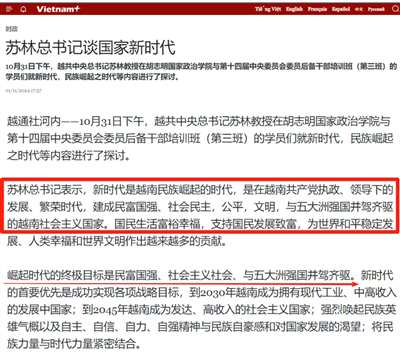 ——“苏林总书记表示,新时代是越南民族崛起的时代,是在越南共产党执政、领导下的发展、繁荣时代,建成民富国强、社会民主,公平,文明,与五大洲强国并驾齐驱的越南社会主义国家。”