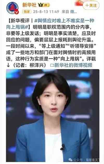 新华社8月13日发布《舆情应对“唯上不唯实”是一种“向上甩锅”》的短视频评论。
