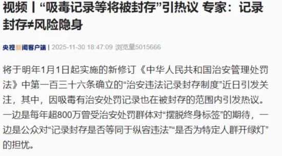 据央视新闻,新修订的《中华人民共和国治安管理处罚法》将于2026年1月1日实施。其中的一百三十六条确立的“治安违法记录封存制度”引发热议,因为这个条款将“因吸毒有治安处罚记录”也包含在封存范围内。
