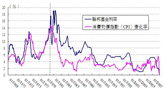 资料来源﹕联邦基金利率来美联储网站(http://www.federalreserve.gov/releases/h15/data/Monthly/H15_FF_O.txt)﹔消费物价指数来自美国劳工部网站(ftp://ftp.bls.gov/pub/special.requests/cpi/cpiai.txt)。