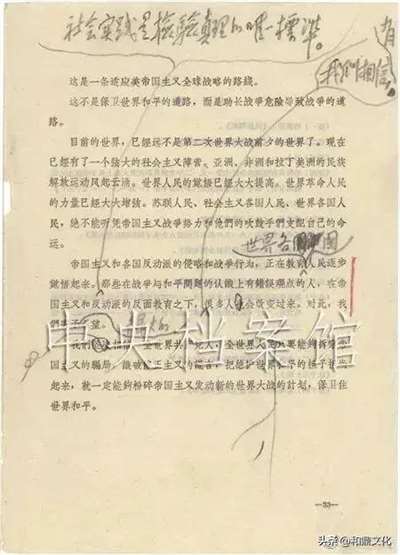 毛泽东在《五评苏共中央的公开信》定稿第一页上写的批语:“社会实践是检验真理的唯一标准”