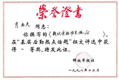 【1998年《新伙食标准实施后》荣获《解放军报》一等奖】