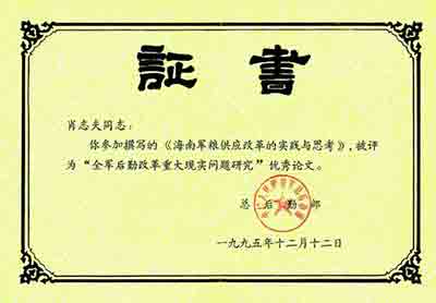 【1995年《海南军粮供应改革的实践与思考》荣获“全军后勤改革重大现实问题研究”优秀论文】