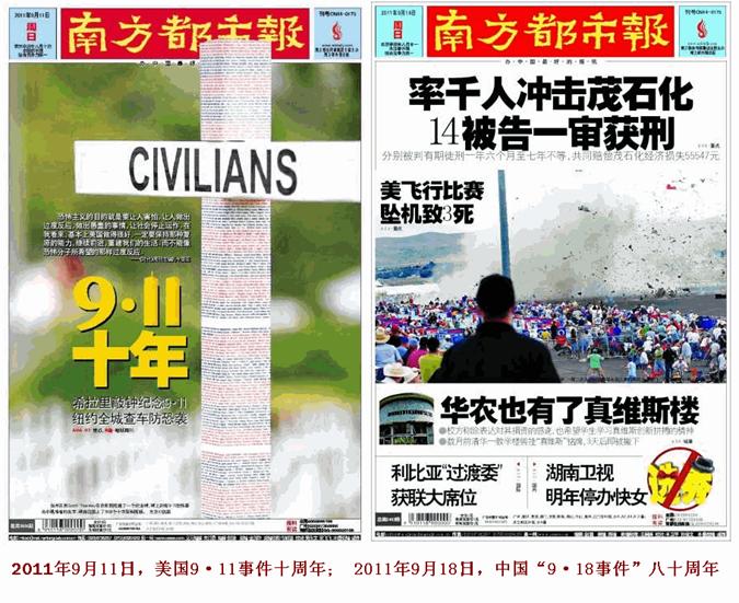 2011年9月11日(右)与9月18日(左)《南方都市报》头版