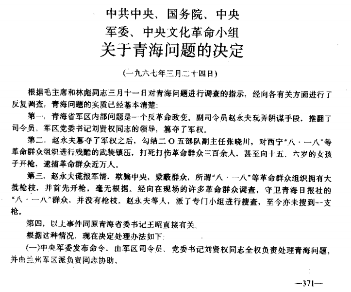 【中共中央、国务院、中央军委、中央文化革命小组关于青海问题的决定