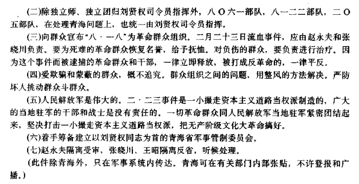 (一)中央军委发布命令,由军区司令员、党委书记刘贤权同志全权负责处理青海问题,并由兰州军区派负责同志协助。