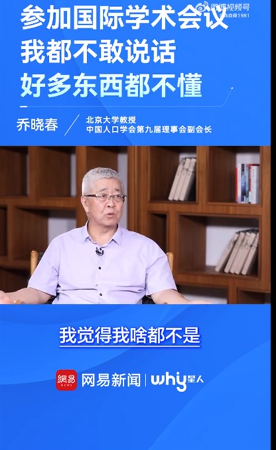 昨天谈了北京大学、人民大学乔晓春教授“听不懂外国人讲什么”的视频,感觉意犹未已。 再欣赏一下乔教授的原话。 乔教授在视频中说,“就是这样呀,所以我为什么说,我们不敢承认我们是世界一流,你连到了人家的圈子里头,人家讲的什么你都听不懂,哪来的自信心我是世界一流啊?”记者问:“你是北大教授呀,你都承认自己有不懂?”乔教授又说,“就是这