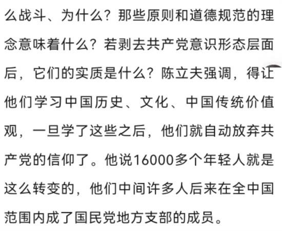 陈立夫对于自己成功地“改造”了16000多名年轻共产党人回到国民党那里的事实感到非常骄傲……陈立夫强调,得让他们学习中国历史、文化、中国传统价值观,一旦学了这些之后,他们就自动放弃共产党的信仰了。
