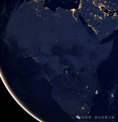 请注意美国国家航空航天局(NASA)2012年拍摄的一张太空照片,该照片展示了非洲国家的照明情况[1]。我们在照片上标注了非洲大陆的几个最贫困国家:1——刚果(金);2——布隆迪;3——马拉维;4——莫桑比克;5——马达加斯加。如你们所见,这些国家都有照明,而且数量相当可观——照片上能看到许多黄色的点,这表明居民住宅中有电。