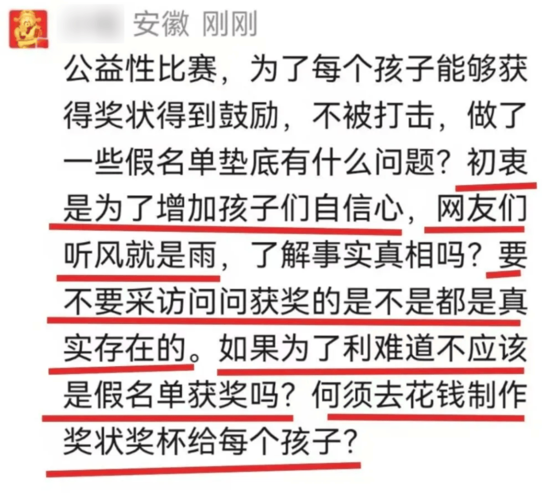 例如有一个自称“了解真相”的网友,就一直在评论区表示,一些比赛之所以搞名单造假,主要是为了让每个比赛的孩子都能得到鼓励,所以就做了一些假名单垫底,初衷其实是为了给孩子增加自信心: