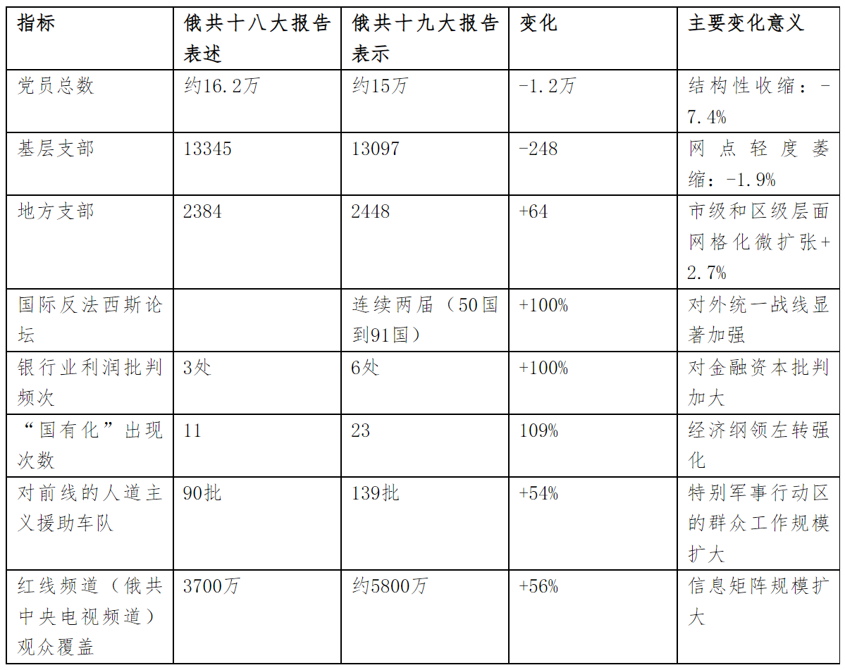 时间:2025年7月6日 稿件种类:重要消息 译者:冷西 陈慧 俄共中央国际部授权发布俄罗斯联邦共产党第十九次全国代表大会人事变动、俄共十八大政治报告与俄共十九大政治报告的关键指标与表述的对比、解读 一、核心指标量化对比 二、指标解读 1.组织建设维度: 1)数量变化:党员与基层支部数量“双降”,地方支部“小升”——表明俄
